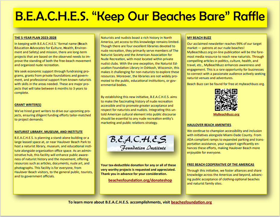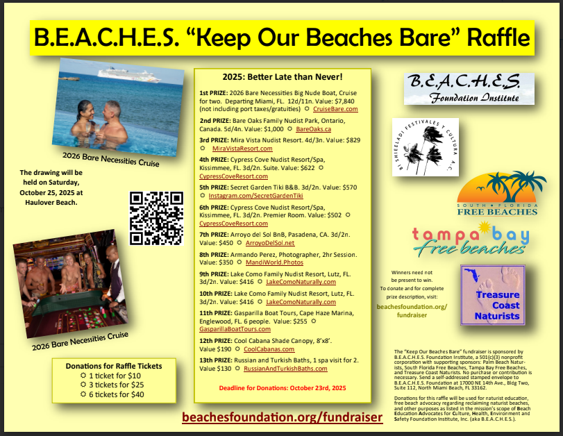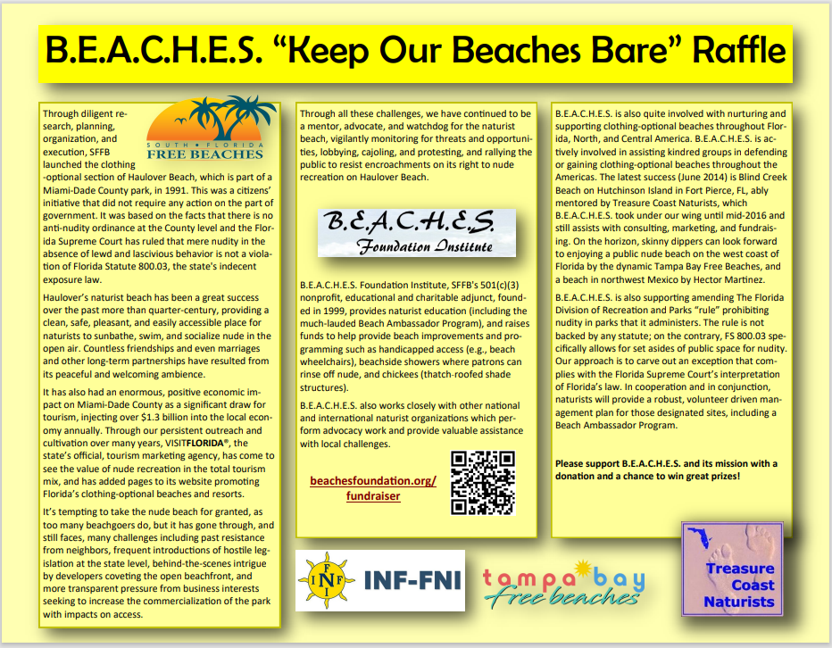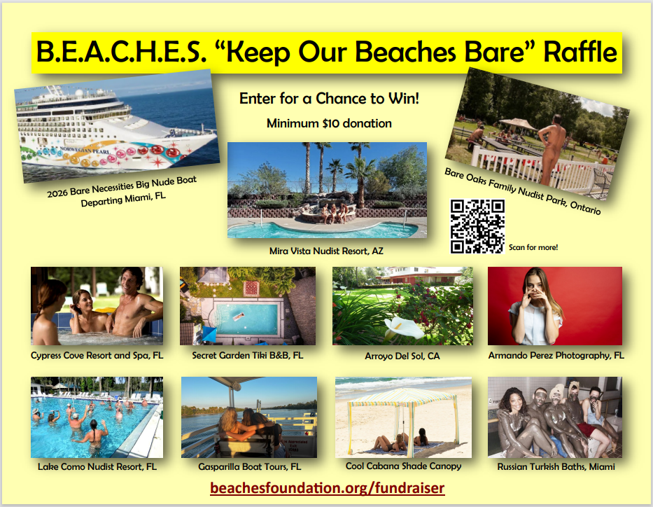 B.E.A.C.H.E.S. Foundation Institute needs you to visit or write to your Florida State Representative and Senator (if you are a Florida resident) or write to Florida legislative leaders (if you live outside of Florida) to encourage them to pass pro-nudity legislation in the 2021 legislative session, which starts soon. Click here for more details.